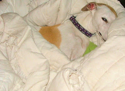 She was the most efficient self-coverer. She could wrap herself in a blanket so effectively, that you could peer in a crate, or pass by a couch, or sit on your bed, and not realize there was a little whippet tucked in. In her dotage, she gifted me with the privilege of covering her.